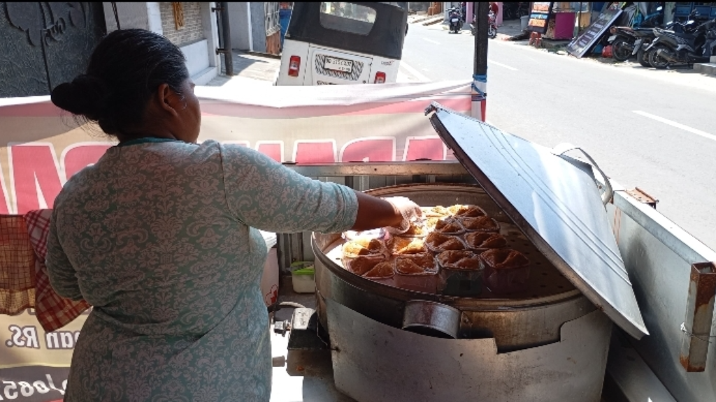Adonan kemudian ia bawa ke lokasi berjualannya. Ada panci kukus besar lengkap dengan cetakan - cetakan kecil berbentuk segitiga di sana.