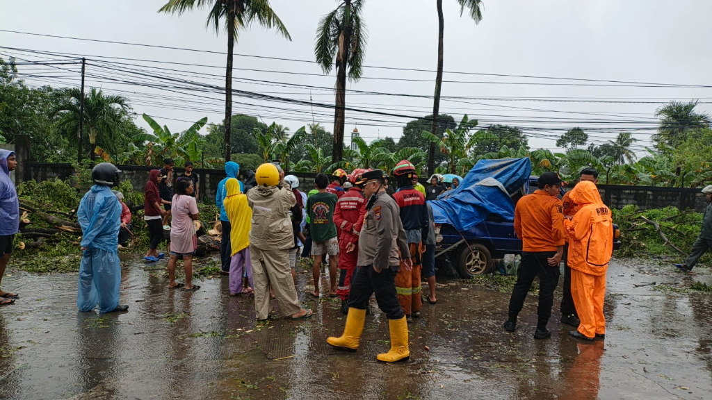 Pohon tumbang menimpa sebuah mobil pick up penjual rambutan, Toyota Kijang dengan nomor polisi DD 1298 CZ yang tengah terparkir di bahu jalan.