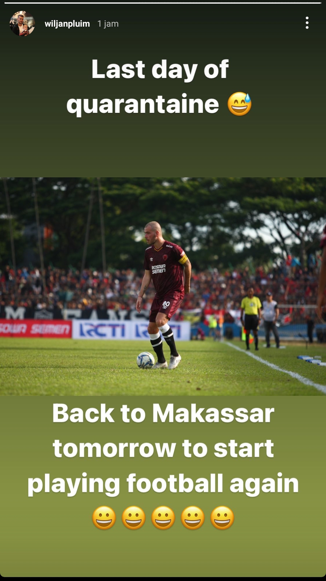 Dalam unggahan di Instastory, Jumat sore (28/5), Pluim mengungkapkan ia menjalani hari terakhir karantina, dan akan kembali ke Makassar untuk mulai bermain sepak bola lagi.