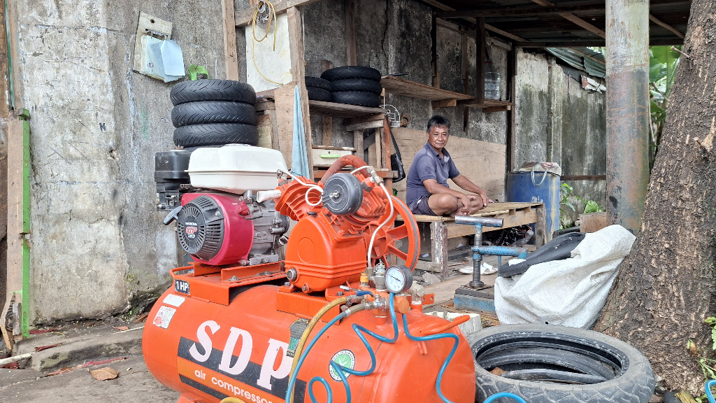 Kini, setelah bangunan dibongkar, peralatan usaha disimpan di bagian dalam area gudang. Ia tetap menjalankan jasa tambal bannya, kendati sempat mengalami kecurian.