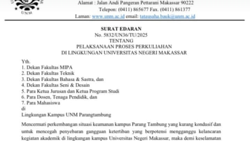 Keputusan tersebut tertuang dalam Surat Edaran Nomor 5832/UN36/TU/2025, yang ditandatangani oleh Wakil Rektor Bidang Akademik UNM, Dr. Hj. Andi Aslindah, M.Si., pada 5 November 2025.
