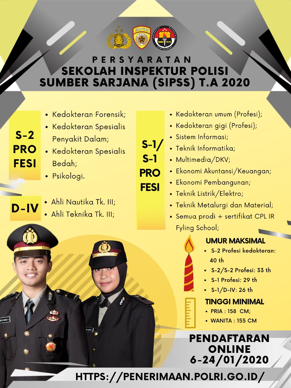 Lalu, untuk batasan umur penerimaan Polri SIPSS 2020, maksimal 40 (empat puluh) tahun untuk S-2 Profesi kedokteran, maksimal 33 (tiga puluh tiga) tahun untuk S-2/S-2 Profesi dan S-1/S-2 berkompetensi tertentu, maksimal 29 (dua puluh sembilan) tahun untuk S-1 Profesi, dan maksimal 26 (dua puluh enam) tahun untuk S-1/D-IV.