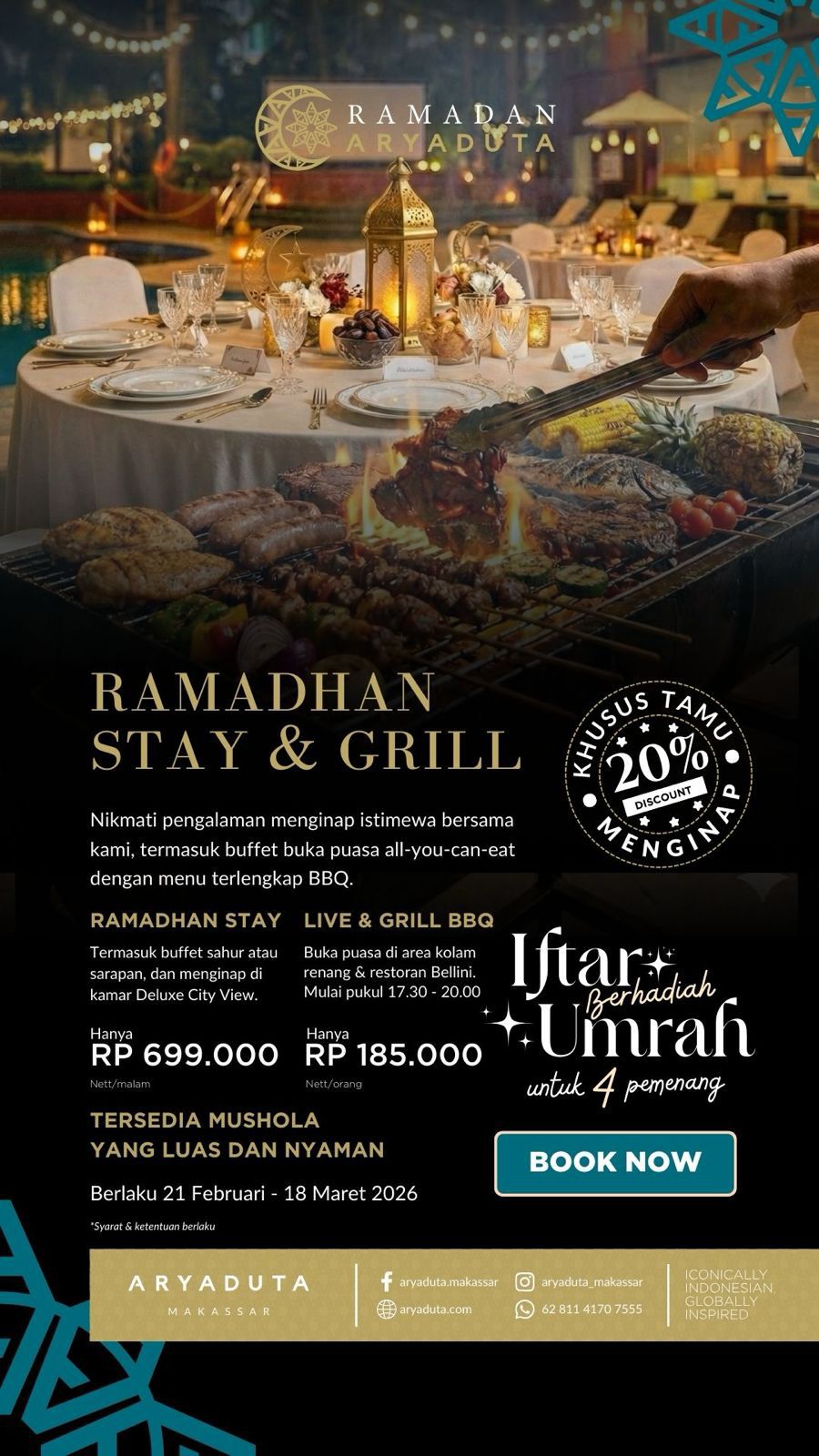 CELEBESMEDIA.ID, Makassar - Selama bulan suci Ramadan 1447 H, Aryaduta Makassar kembali menghadirkan pengalaman berbuka puasa yang istimewa melalui program bertajuk “Live & Grill BBQ Ramadan Experience”.