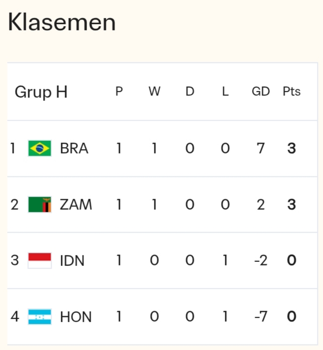 Hasil ini membuat Indonesia berada di peringkat ketiga klasemen sementara Grup H Piala Dunia U-17 2025 tanpa poin dari satu pertandingan, sedangkan Zambia menempati posisi kedua dengan tiga poin.