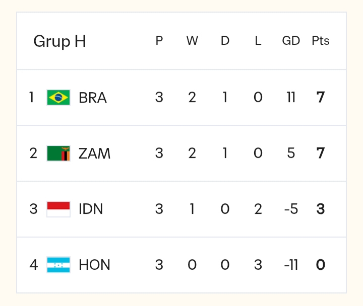 Brasil lolos ke babak 32 besar dengan status juara Grup H berkat keunggulan selisih gol, sementara Zambia melaju ke fase berikutnya setelah sebagai runner-up Grup H.